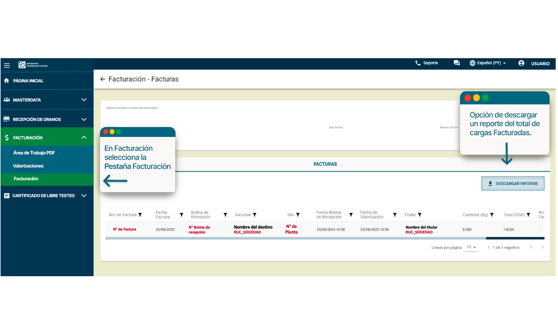 Te indicaremos lo que podrías visualizar en el área de trabajo de la sección facturación, aquí se detallan por titular el total de cargas entregadas en tu silo, la cantidad de cupo consumido y la cantidad valorizada.