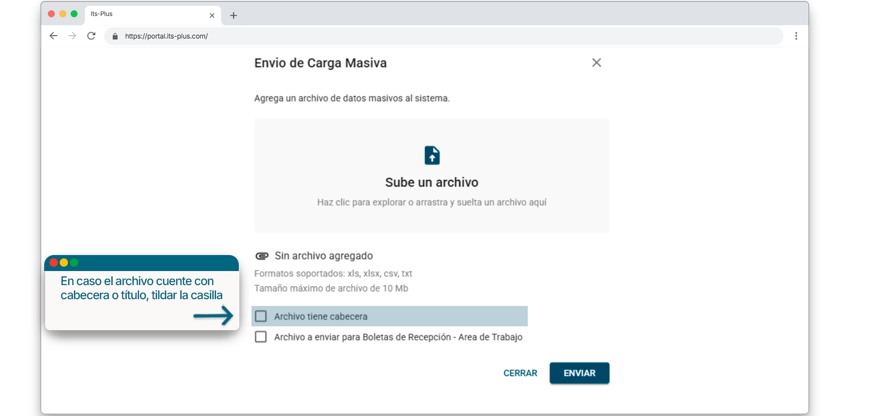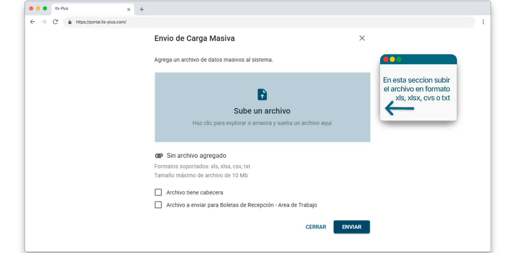 Recuerda que los formatos de archivos admitidos por ITS son .xls, .xlsx, .csv (delimitados por coma) y .txt.